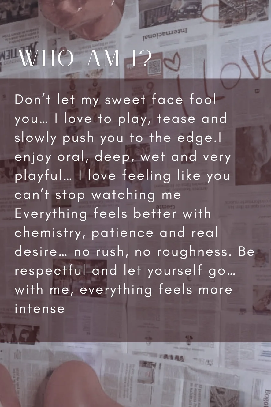 Quien soy? No te dejes engañar por mi dulce rostro… Me encanta jugar, provocarte y llevarte lentamente al límite. Disfruto del sexo oral, profundo, húmedo y muy juguetón… Me encanta sentir que no puedes dejar de mirarme. Todo se siente mejor con química, paciencia y deseo real… sin prisas, sin brusquedad. Sé respetuoso y déjate llevar… conmigo, todo se siente más intenso